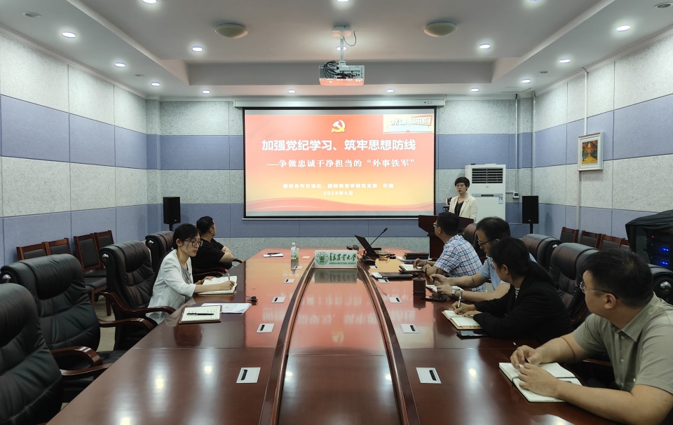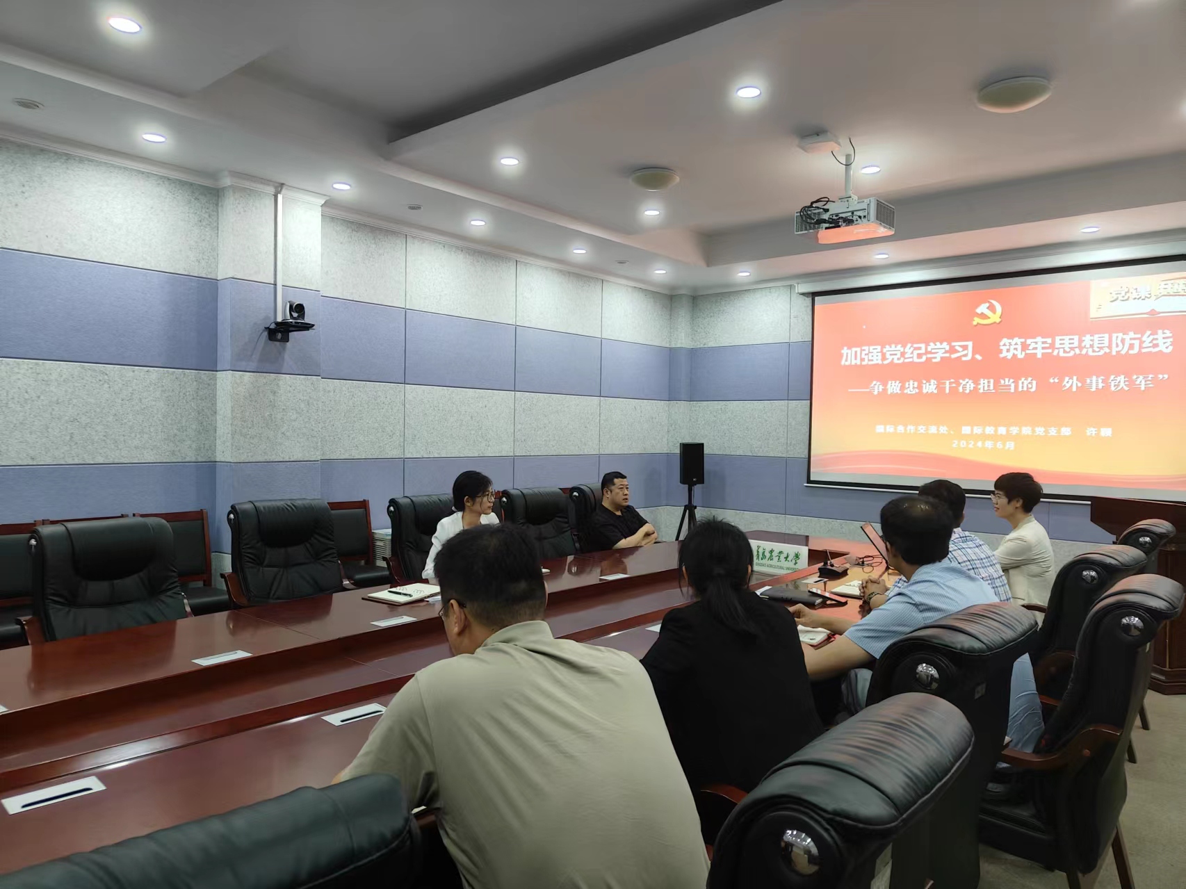 6月27日下午,太阳成集团tyc9728、国际教育学院党支部书记许颖在专家楼117室以“加强党纪学习、筑牢思想防线—争做忠诚干净担当的‘外事铁军’”为题,为党支部全体党员讲授党纪学习教育专题党课。党委委员、副校长王永健以普通党员身份参加本次活动。