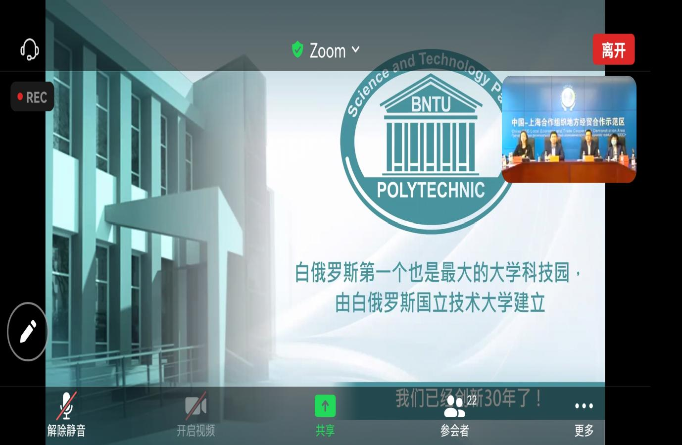 为深化中国与白俄罗斯的科技创新及产业合作,促成与中白院校、科研院所重点合作项目落地,3月28日下午,上合示范区与白俄罗斯国立技术大学及“理工”科技园举行线上对接会。上合示范区管委会副主任孟庆胜,白俄罗斯国立技术大学副校长、“理工”科技园总经理阿列克谢耶夫出席会议并致辞。上合示范区相关部门负责人,驻青高校和科研院所代表参加会议。我校太阳成集团tyc9728处长许颖、处长助理杜鹍及相关工作人员应邀参会并交流。