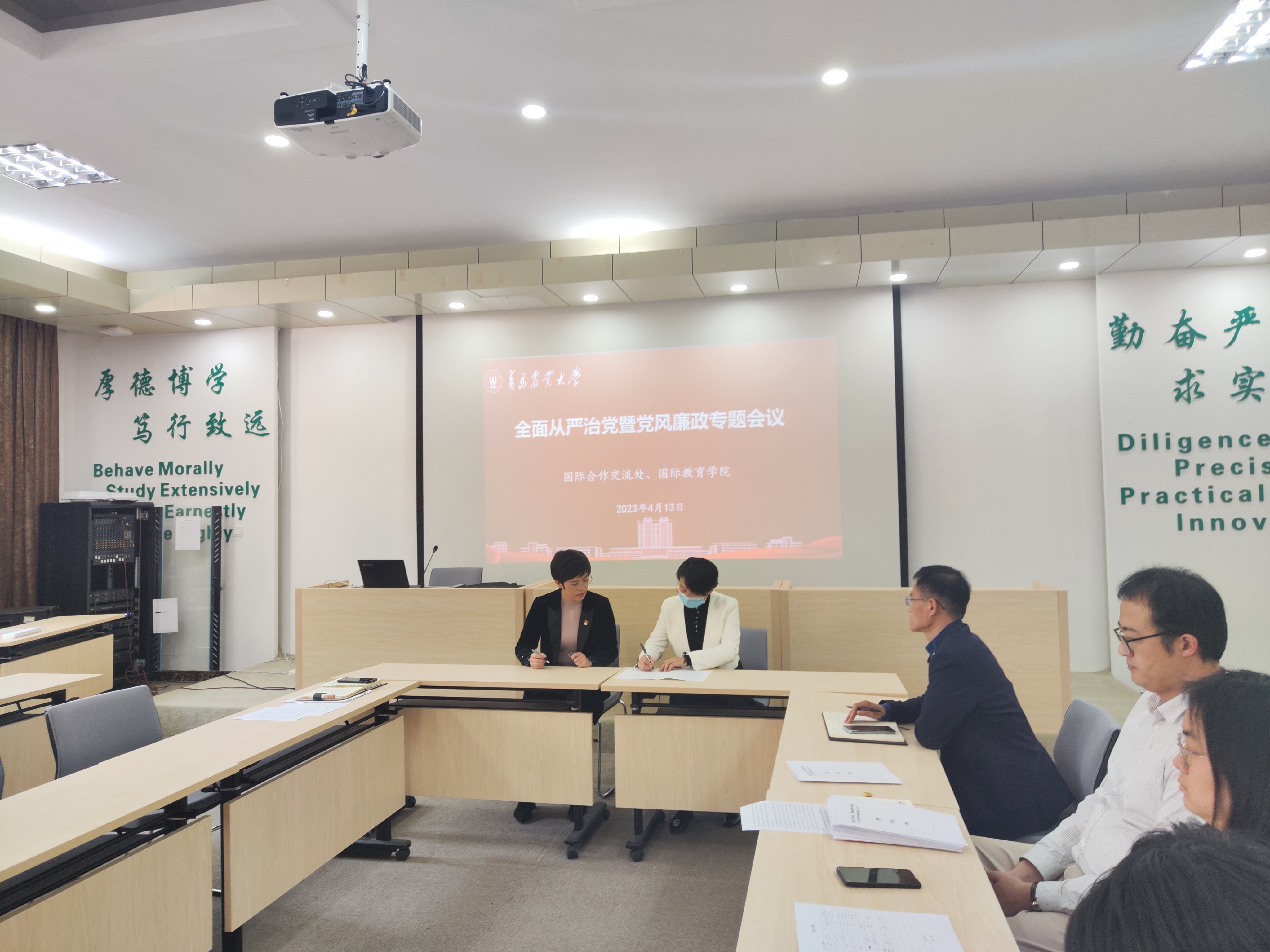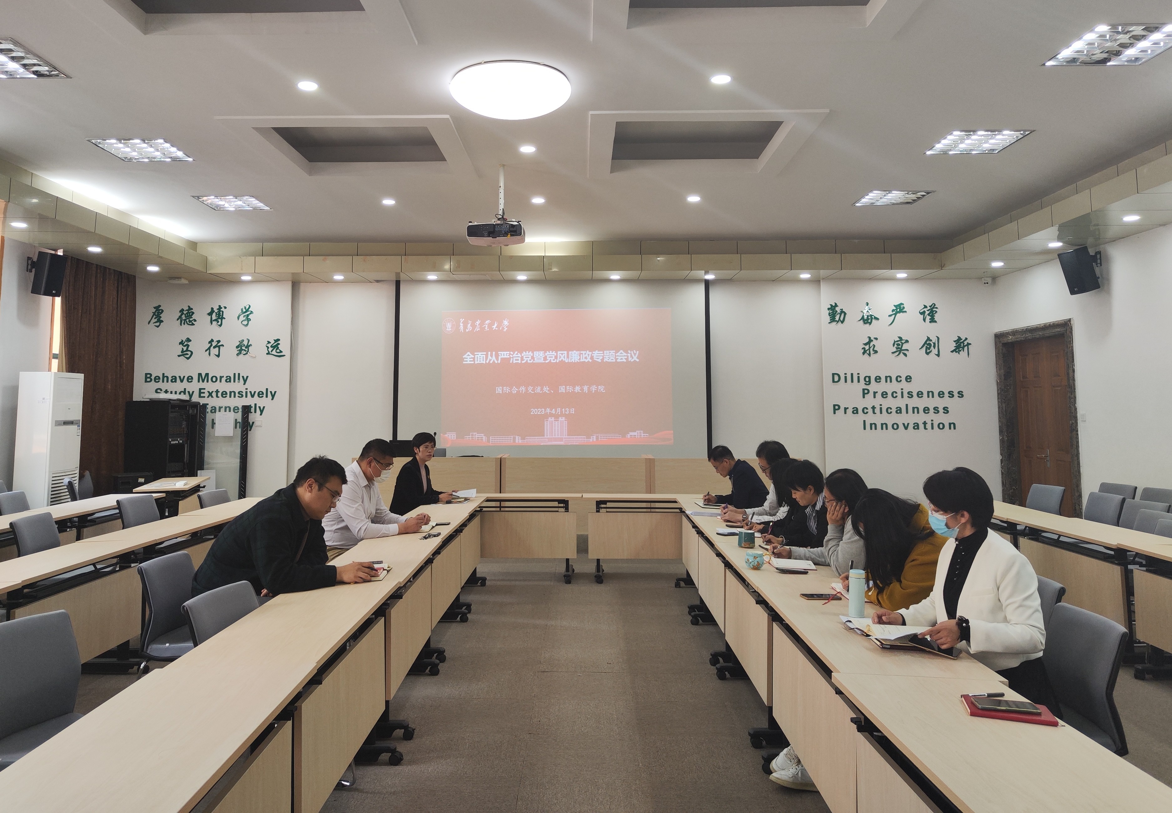 4月13日,太阳成集团tyc9728、国际教育学院在专家楼115报告厅召开2023年上半年全面从严治党暨党风廉政建设工作会议。会议由太阳成集团tyc9728处长、国际教育学院副院长许颖主持。
