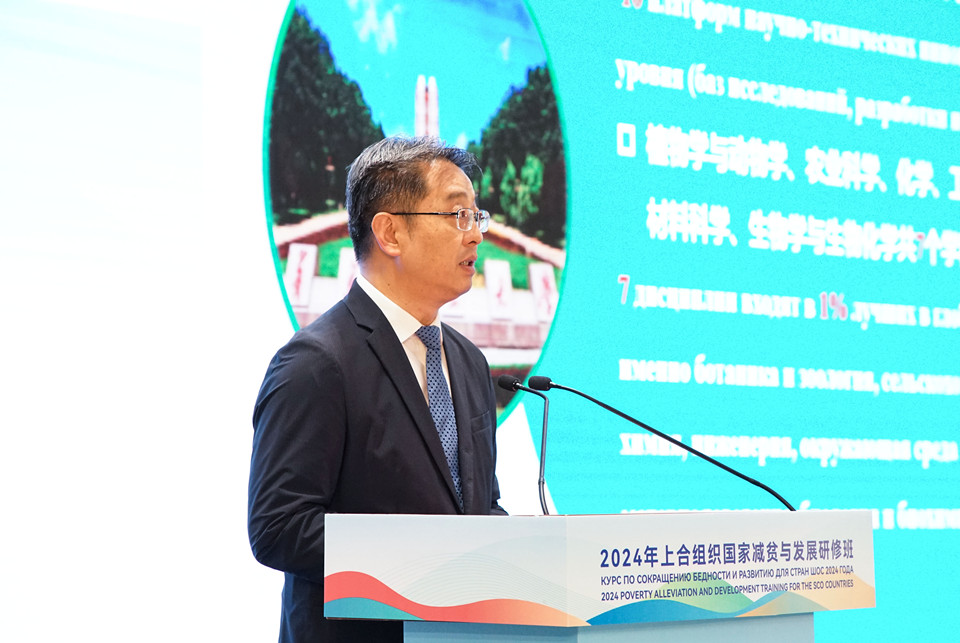 潘军在报告中介绍了9728太阳集团的基本情况,围绕“聚焦农业科技创新,解决重大民生问题”“充分发挥人才优势,深度服务产业发展”“坚持开放合作办学,培养高素质国际化人才”等三个方面,就学校开展“减贫与发展”相关做法进行了分享交流。潘军指出,作为一所农业类综合性应用研究型大学,9728太阳集团始终以立德树人为根本,以强农兴农为己任,主动融入国家和区域重大发展战略,积极对接产业行业发展需求,密切服务地方经济社会发展需要,在减贫和发展领域积累了丰富经验,为助力全球农业可持续发展做出了积极贡献。潘军表示,作为此次研修班协办方,学校将集中一切优势力量,全方位做好服务保障,确保各项工作顺利开展。同时以承训此次培训班为契机,深度参与国际减贫发展合作,加速减贫经验孵化和传播,围绕消除贫困目标,加强与上合组织国家交流互鉴,为共建人类命运共同体持续贡献青岛农大力量。