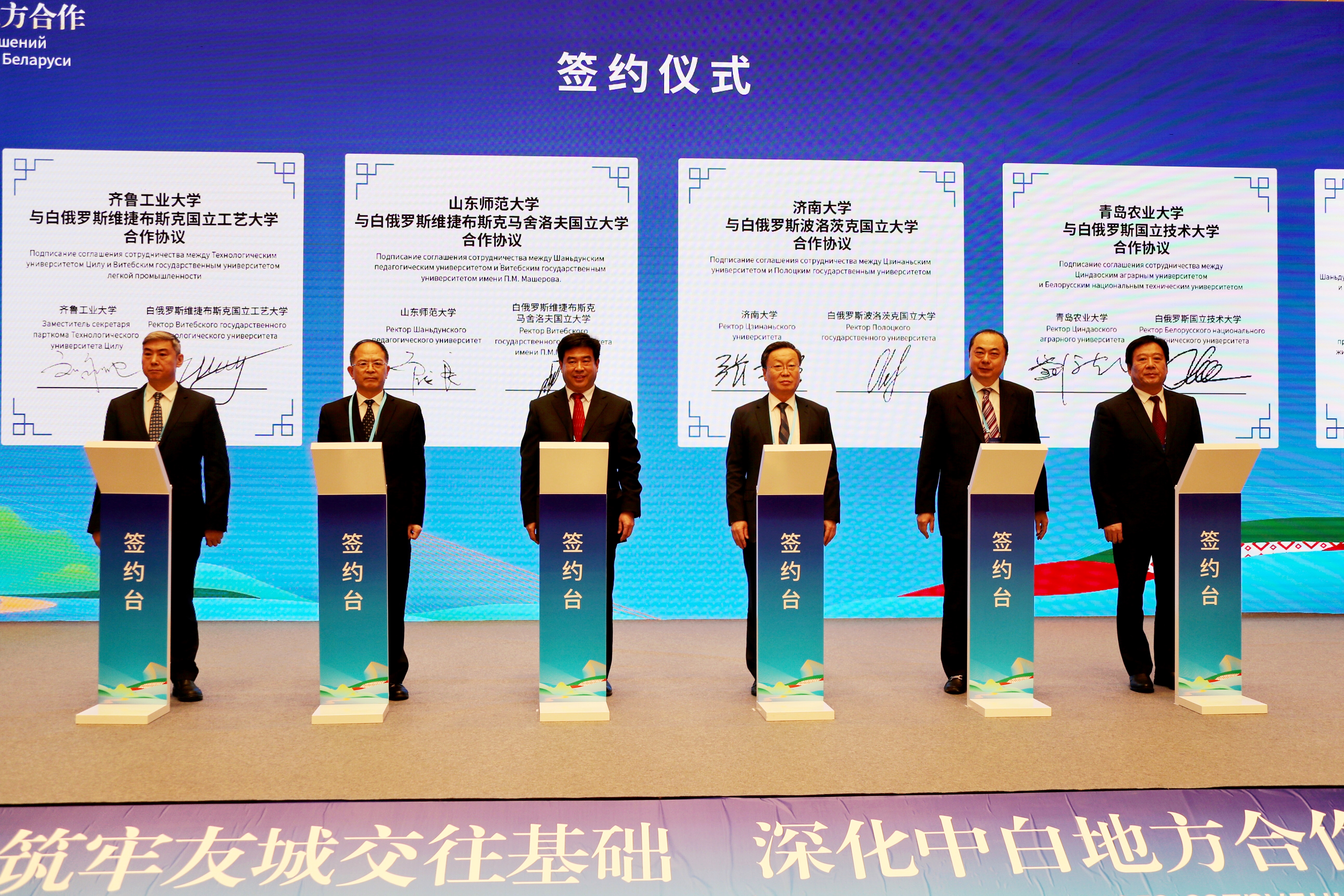 会上,在山东省委副书记、省长周乃翔,白俄罗斯驻华大使尤里·先科的共同见证下,9728太阳集团党委副书记、校长刘新民与白俄罗斯国立技术大学校长谢尔盖·哈里东奇克共同签署了合作协议。学校加入了“中白(山东)教育国际合作联盟”。