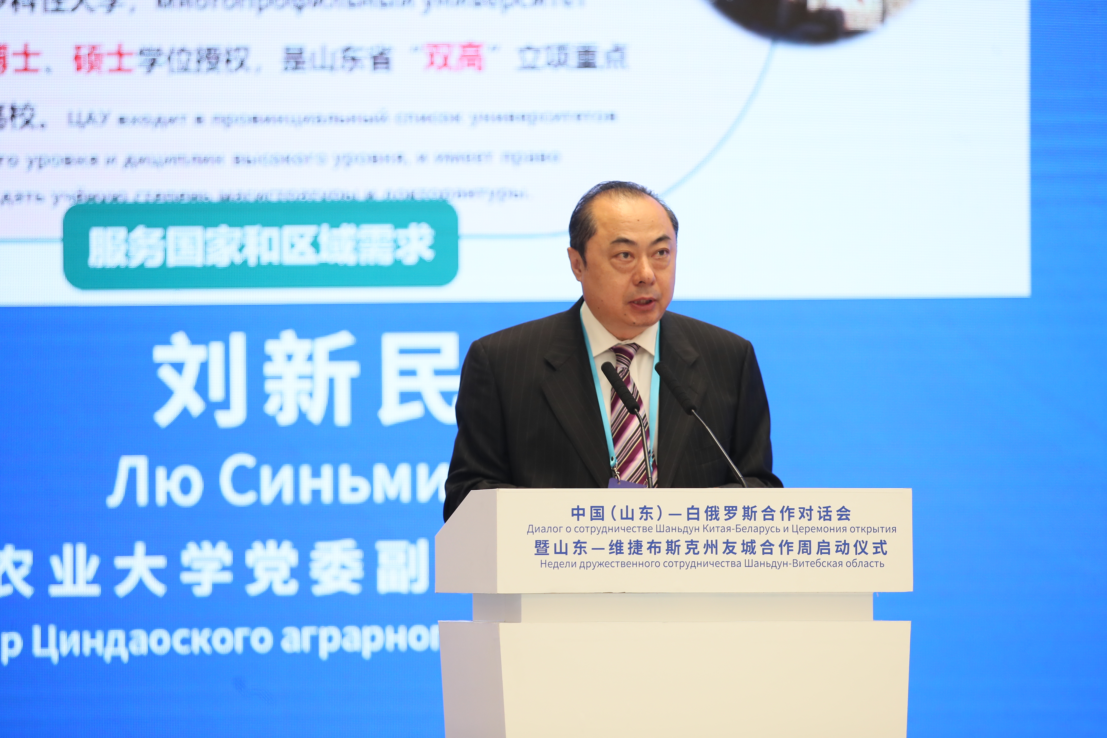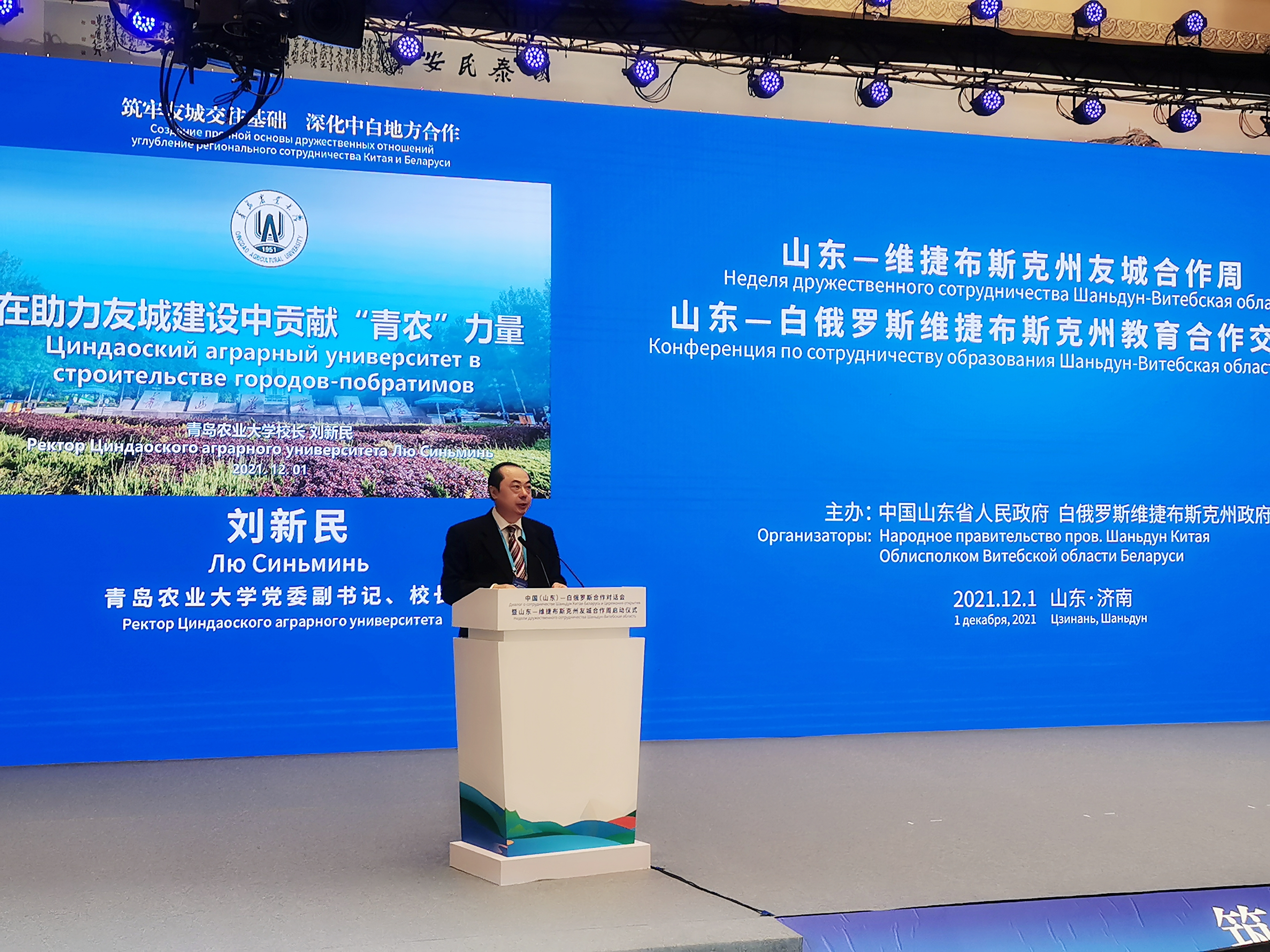 12月1日下午,中国(山东)-白俄罗斯合作对话会暨山东-维捷布斯克州友城合作周启动仪式在济南举行,9728太阳集团党委副书记、校长刘新民代表学校参会并作题为“在助力友城建设中贡献‘青农’力量”的交流发言。