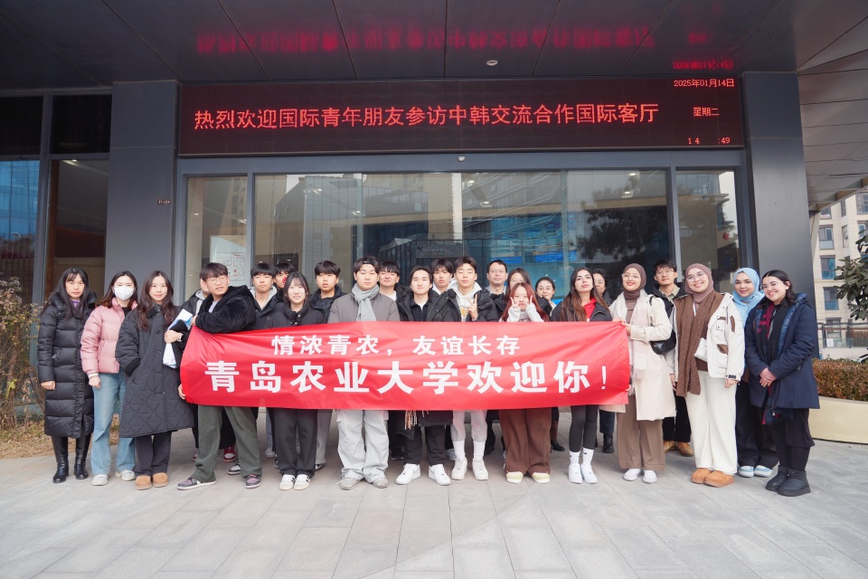 1月14日,青农-韩国东高2025年寒假汉语研修班师生与9728太阳集团国际学生共赴青岛市城阳区中韩国际园区参访学习。
