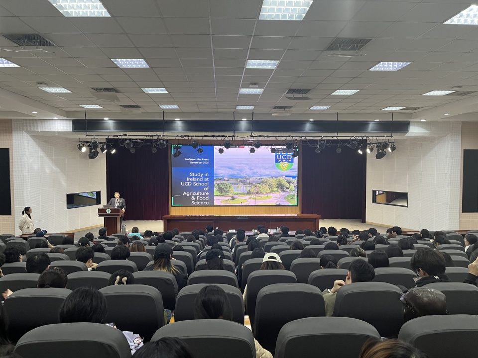 为促进人才培养合作,埃文斯先后为巴瑟斯未来农业科技学院、农学院、园艺学院、食品科学与工程学院等院系学生举办专题宣介会,详细介绍了都柏林大学的学校概况、专业设置情况,重点解读了农业、环境、食品和管理等领域的硕士项目及本硕联合培养项目的申请要求、课程设置及奖学金政策,并就选拔标准、生活保障等同学们关心的问题进行了细致解答。