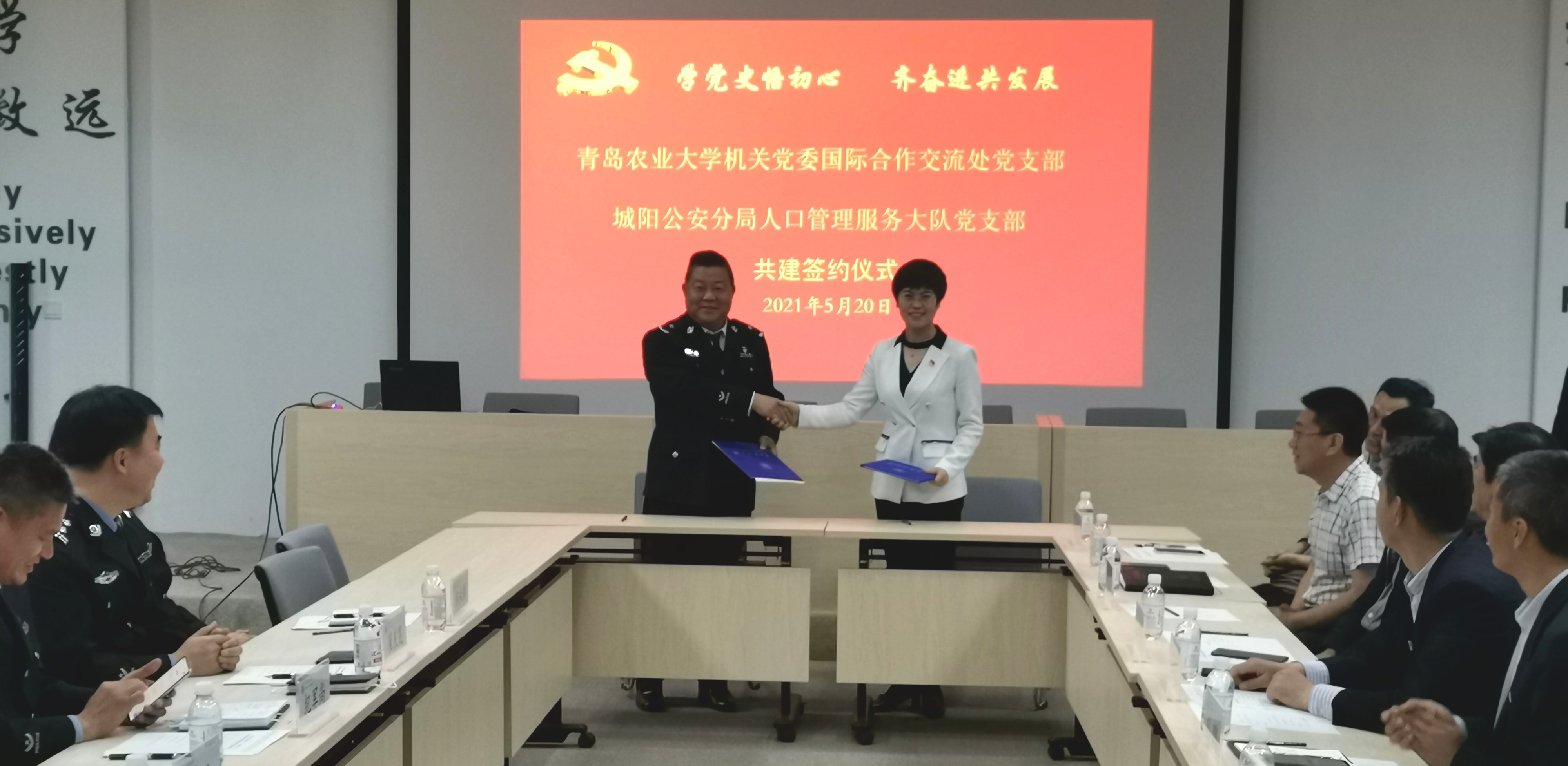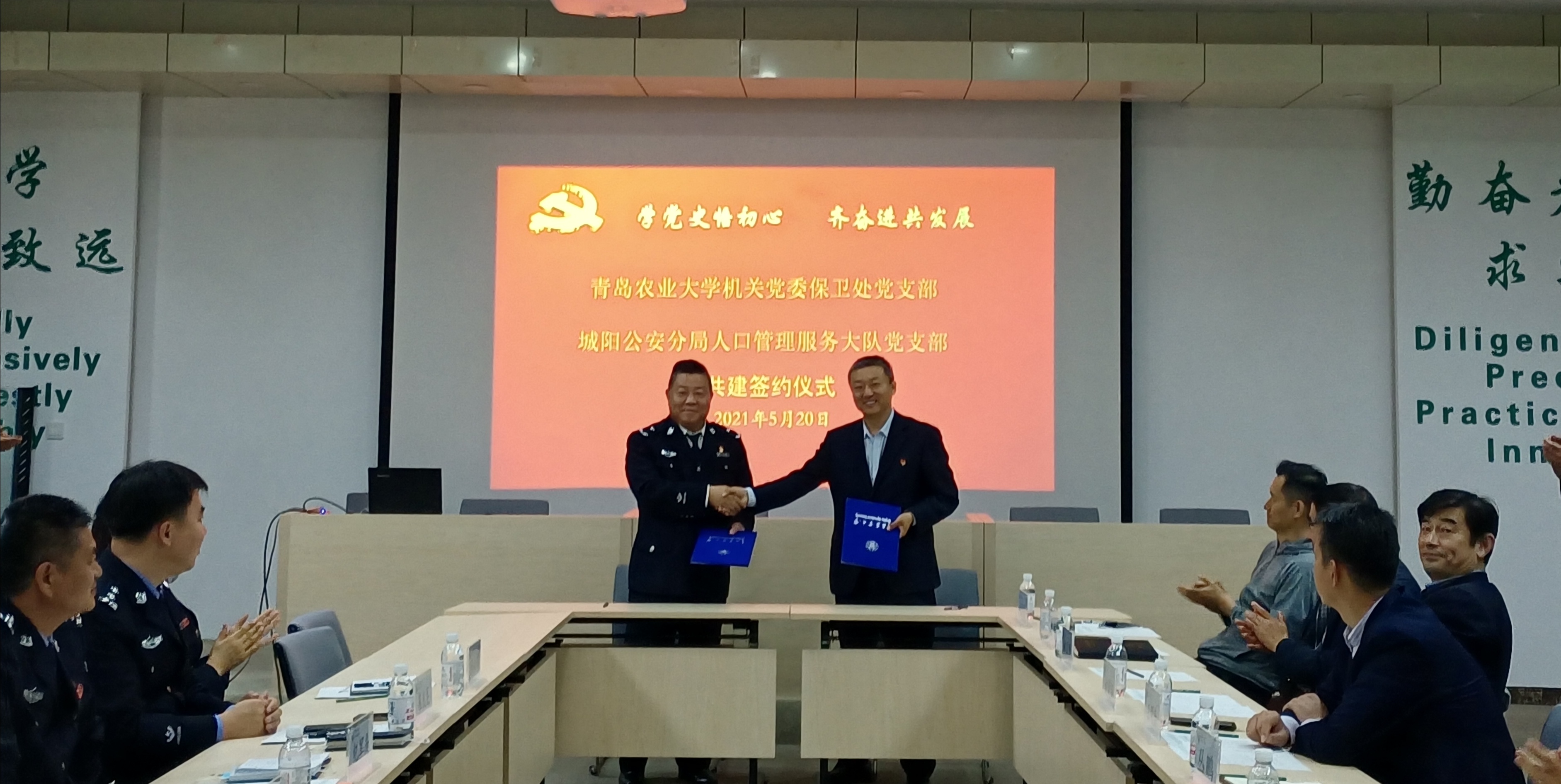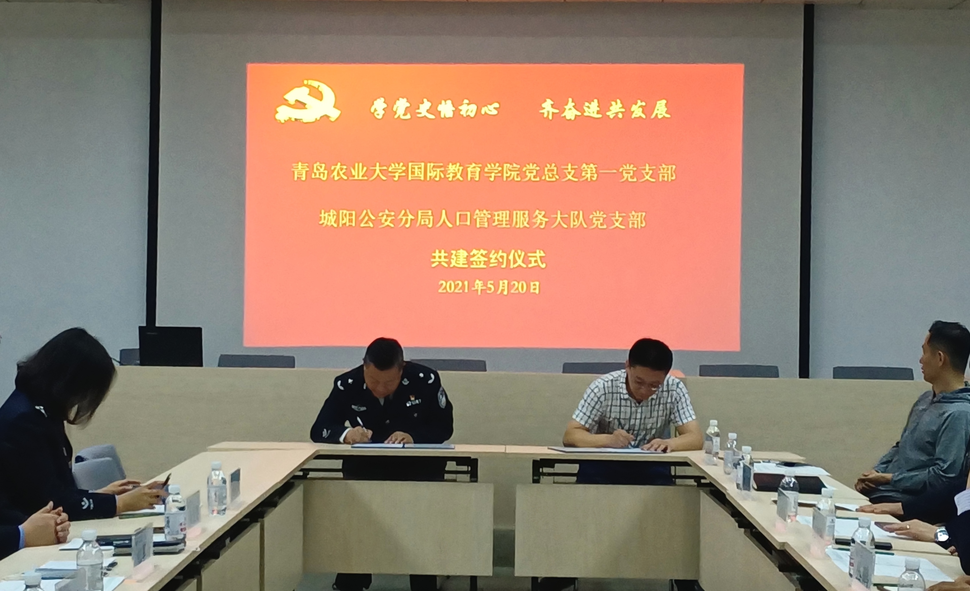 为深入学习贯彻习近平总书记在党史学习教育动员大会上的重要讲话精神,扎实推进“学史明理,学史增信,学史崇德,学史力行”等重要指示,努力做到“学党史、悟思想、办实事、开新局”,并进一步加强基层党组织建设,增进支部间的学习交流,促进支部共同发展,充分发挥党支部战斗堡垒作用,5月20日上午,太阳成集团tyc9728党支部会同保卫处党支部、国际教育学院党总支第一党支部在专家楼115报告厅与青岛市公安局城阳分局人口服务管理大队党支部举行党支部共建签约仪式暨交流座谈会。