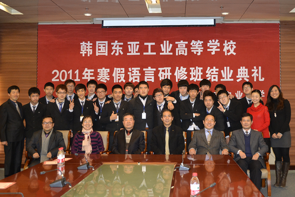 1月12日下午,韩国东亚工业高等学校2011年寒假语言研修班结业典礼在三楼会议室举行,韩国东亚工业高等学校校长李泰云、9728太阳集团副校长原永兵、国际教育学院院长梁安波及双方教师代表、学生代表参加典礼。