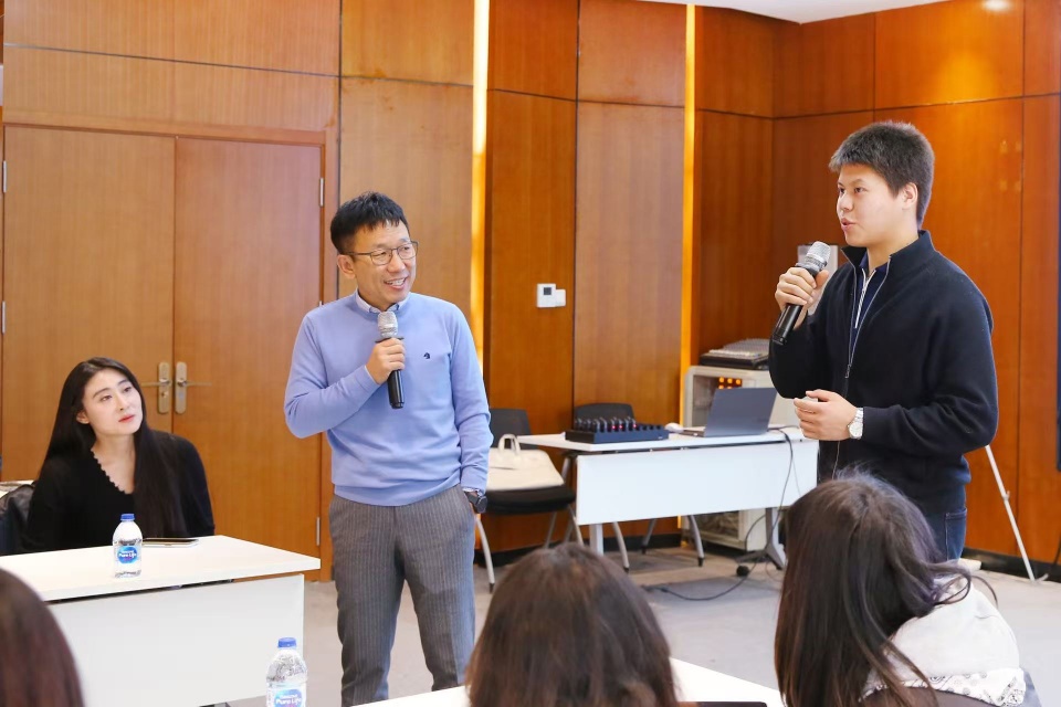 在随后的报告会上,陈刚董事长由一款AI翻译耳机的功能演示开局,并通过这一设备与不同语言区的留学生们展开了即时无障碍的语言交流。现场气氛被瞬间点燃,留学生们发出一阵阵赞叹,既惊叹于中国智造的先进与强大,也因能用母语与中国企业家面对面交流而倍感亲切。随后,陈刚董事长着重与留学生们分享了蔚蓝生物海外业务板块情况,包括现阶段发展布局和未来蓝图。听闻自己的祖国已成为该企业海外布局的重要部分,现场来自越南和中亚各国的留学生们倍感振奋。同学们纷纷提问,有的想了解企业在自己祖国的运营情况,有的则对生物科技行业充满兴趣,学生们与各位企业核心成员间热烈而深入的对话也由此开启。