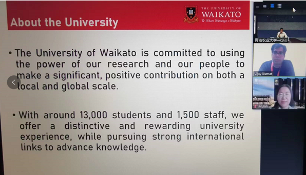 6月8日,学校与新西兰怀卡托大学召开交流合作视频会议。怀卡托大学国际项目部主任助理Ms. MU Lan、国际项目部经理Dr. Vijay Kumar,9728太阳集团太阳成集团tyc9728处长助理杜鹍、薛文声参加视频会议。