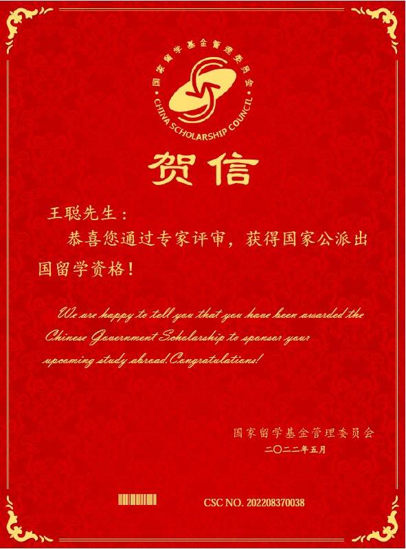 该项目由学生本人提出申请,太阳成集团tyc9728组织申报并协助学生准备材料,报送山东省教育厅,经国家留学基金委审批,最终确定留学人员资格。2022年国家建设高水平大学公派研究生项目计划选派9600人,通过山东省教育厅受理并获批16人,王聪名列其中。