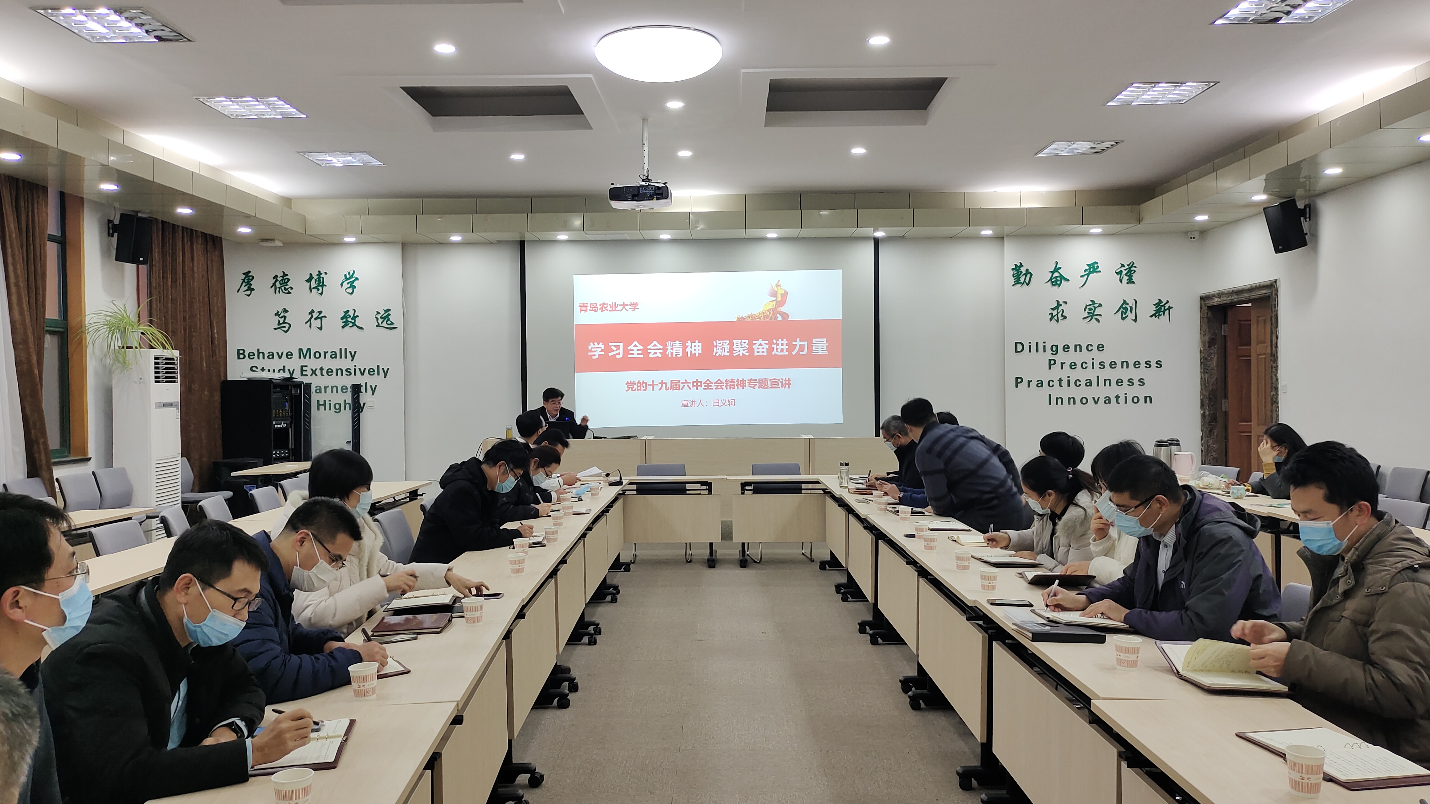 宣讲会上,田义轲以《深入学习贯彻党的十九届六中全会精神》为题,从“深刻认识总结党的百年奋斗重大成就和历史经验的重大意义”“深刻认识党的百年奋斗的初心使命和重大成就”“深刻认识中国特色社会主义新时代的历史性成就”“深刻认识党的百年奋斗的历史意义和历史经验”“深刻认识以史为鉴、开创未来的重要要求”“从党的百年奋斗历程中汲取智慧和力量”“推动全会精神在青岛农大落地生根开花结果”等七个方面对全会精神进行了解读和阐释。