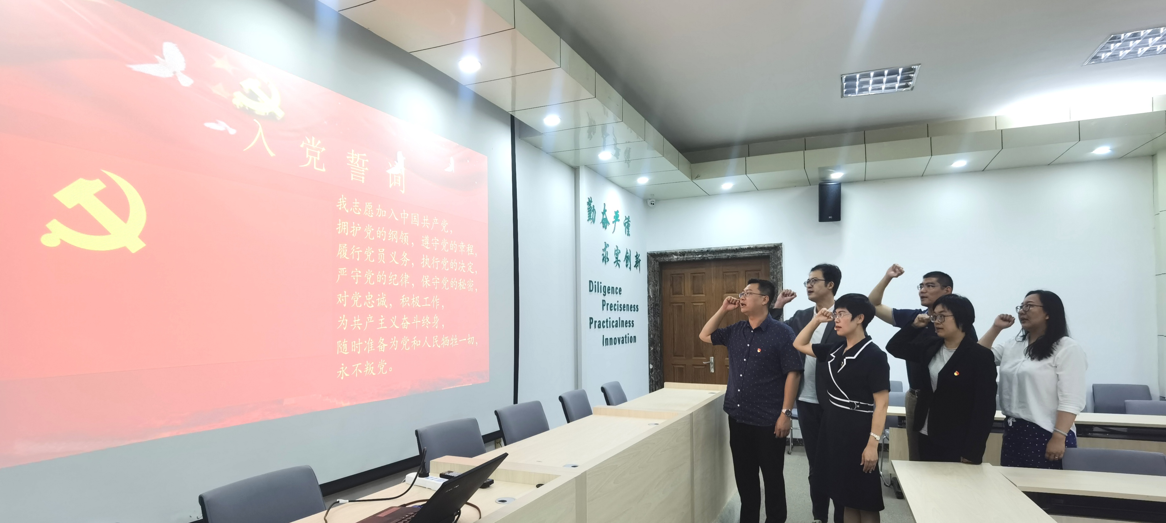 党日活动中,国际处党支部书记许颖带领支部成员面向党旗,高举右拳重温入党誓词。许颖勉励与会党员要通过重温入党誓词,进一步增强作为一名共产党员的责任感和使命感;要不断提高自身修养,牢记自己的庄严承诺,以实际行动恪守对党的忠诚;要以积极进取的心态和创先争优的精神践行入党誓词,勇担当、敢作为、讲奉献,充分发挥先锋模范作用。