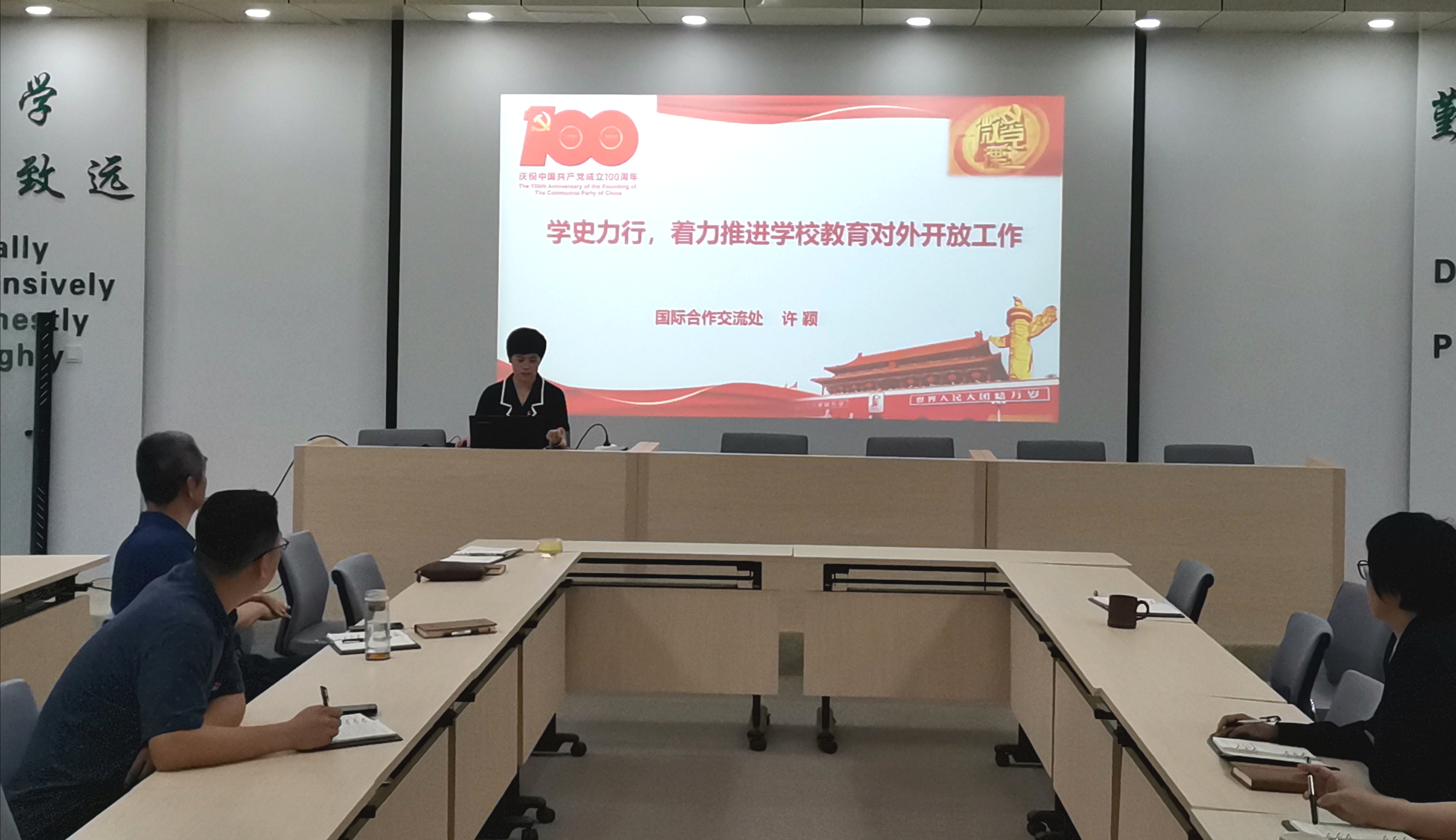 宣誓仪式结束后,许颖以《学史力行 着力推进学校教育对外开放工作》为题,为全体党员上党课。党课从“一百年历史”“一系列讲话”“一封封回信”“一份使命”四个方面,着重回顾了中国共产党的百年辉煌奋斗史;凝练强调了习近平总书记的系列重要讲话和回信精神;明确要求全体党员在中国走进新的历史方位,实现两个“百年”目标的历史交汇期,要提高站位,主动服务国家大局,做出应有贡献。
