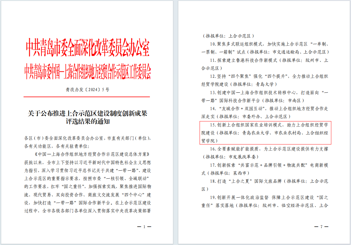 近日,中共青岛市委全面深化改革委员会办公室、中共青岛市委中国—上海合作组织地方经贸合作示范区工作委员会公布了推进上合示范区建设制度创新成果评选结果,学校报送的《创新上合组织国家农业培训模式,助力上合组织经贸学院建设》入选优秀案例。