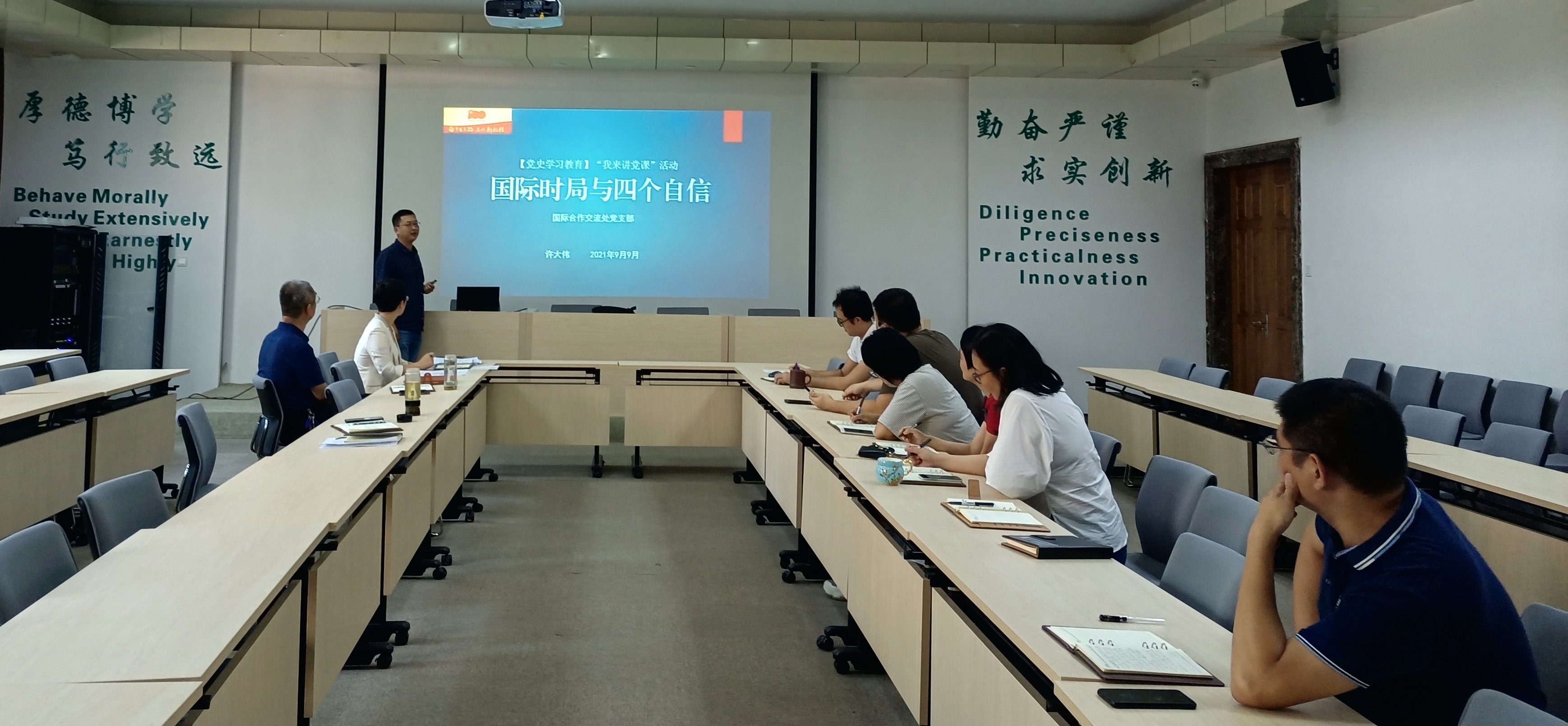 期间,太阳成集团tyc9728副处长许大伟与大家分享了题为《国际时局与四个自信》的微党课。