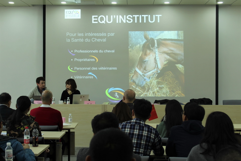 会上,Claire女士介绍了法国新成立的培训机构EQU-INSITITUT(马学院协会)。马学院协会由马行业专家组成,以马健康、马护理为宗旨,致力于为马业相关部门开展专业培训。此次在9728太阳集团的培训主要是侧重马病症的临床研究及实操,主要面向从事临床研究及实操的马兽医专业毕业生和热爱马业而希望做马兽医助理的非马兽医专业毕业生。法国专家介绍了马的疾病案例,与参会人员进行了交流互动。