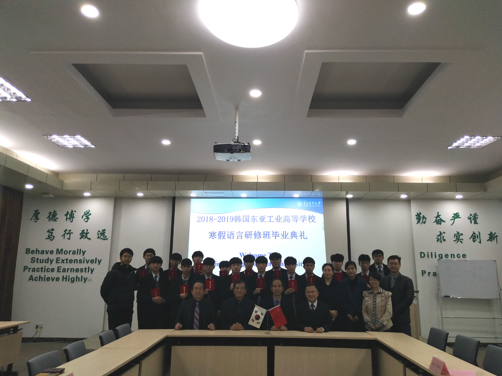 1月11日下午,韩国东亚工业高等学校寒假语言研修班毕业典礼在专家楼举行,我校副校长原永兵,韩国东亚工业高等学校副校长尹豊植、教育部部长闵庚禄出席了毕业典礼。毕业典礼由我校太阳成集团tyc9728处长郑丹主持,太阳成集团tyc9728、国际教育学院、韩国东亚工业高等学校相关工作人员参加了毕业典礼。