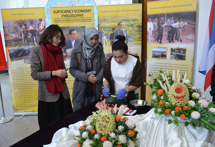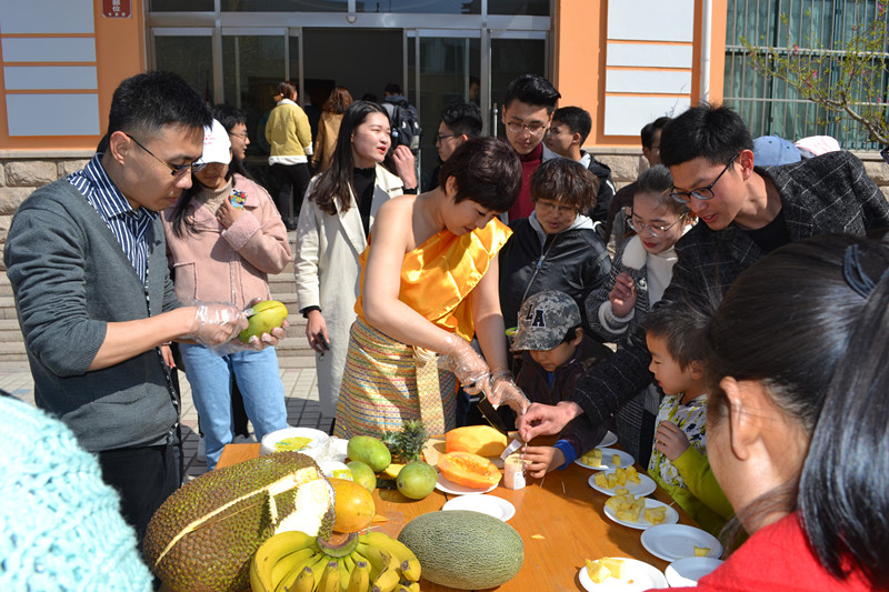 下午,在我校专家楼举办的第一届“一带一路”•中泰文化交流节-泰国美食、美妆、特产、文化交流活动吸引了数百名我校师生参加。泰国博仁大学驻青岛服务中心工作人员为参加活动师生现场展示了泰国民族服饰、具有文化特色的产品,并与大家一起品尝了泰国特产、水果等,其中由泰王国驻青岛总领事馆厨师进行的现场水果雕刻备受欢迎。