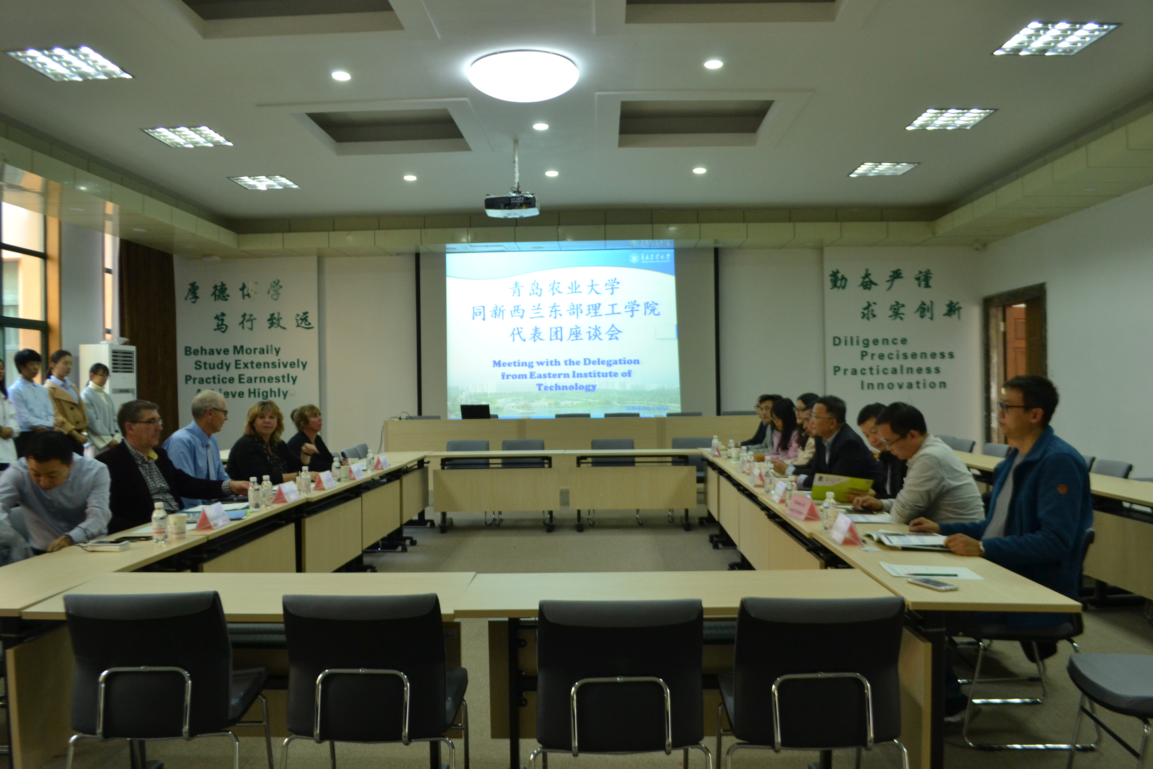 上午,会谈在专家楼会客室进行。牟少岩对来访客人表示热烈的欢迎并向他们详细介绍了我校的发展历史、学科建设、专业设置、教学科研发展现状、国际合作成果等。同时,Natalie Waran也向大家介绍了新西兰东部理工学院的基本情况,指出该校是新西兰国立大学,并在QANZ(评级)中被评为一类院校。经过会谈,基于两校在学科教学及学术研究等方面存在的诸多相似之处,双方就建立相关领域的国际交流与合作达成初步意向。