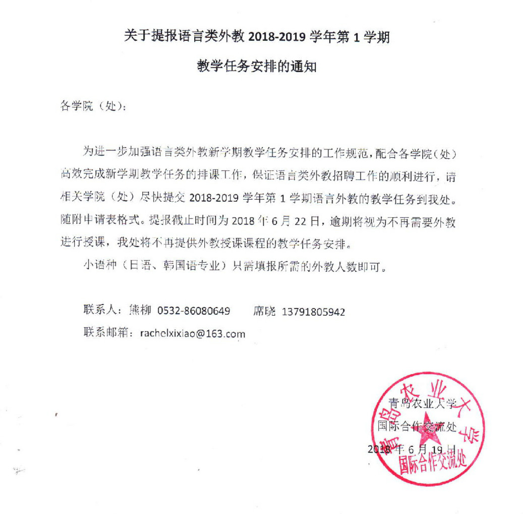 关于提报语言类外教2018-2019学年第1学期教学任务安排的通知